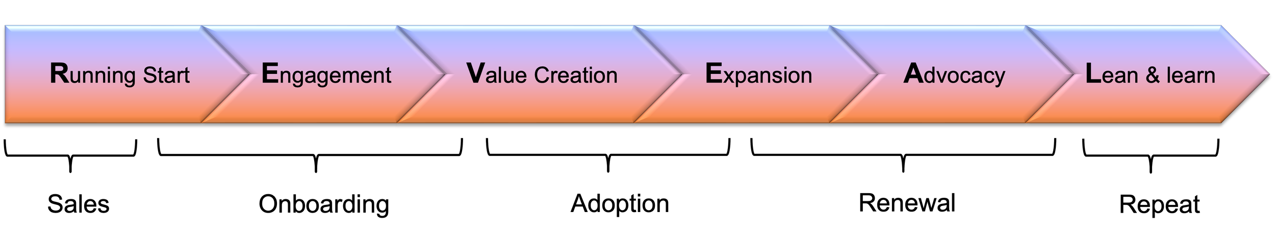 We have a different take on the typical customer lifecycle. We believe efficient revenue extraction begins during the sales cycle with a Running Start before and during onboarding, ensuring proper Executive Engagement, and driving toward Expansion and Customer Advocacy with immediate focus on Value Creation. Then you must take the Learnings of each new customer and optimize for a more Lean process and experience for you and your next customer.